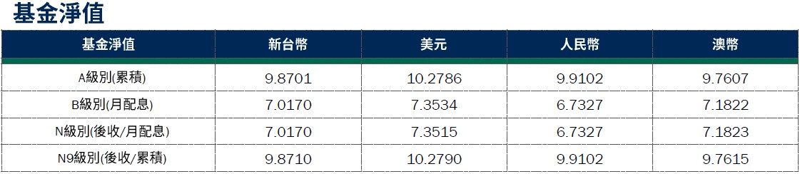 後市展望:聯準會12月如市場預期調降基準利率1碼,但點陣圖顯示2026年僅會降息一次,低於市場預估,然其他成熟國家央行如日本、歐元區、澳洲等釋出鷹派訊息,全球央行基調略有分歧。基金將在波動中適度調整存續期間配置,以期在各區域/國家輪動中掌握投資機會。