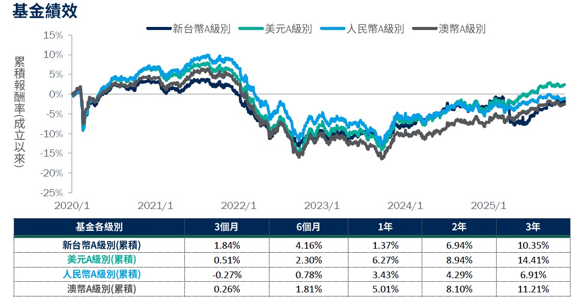 績效說明1:截至12月底,新台幣A級別(累積)績效為1年期1.37%、2年6.94%、3年10.35%。2025年正貢獻來源:利息收入、債券價格與利率期貨;負貢獻來源:匯率與其他(含費用)。