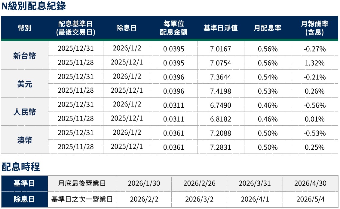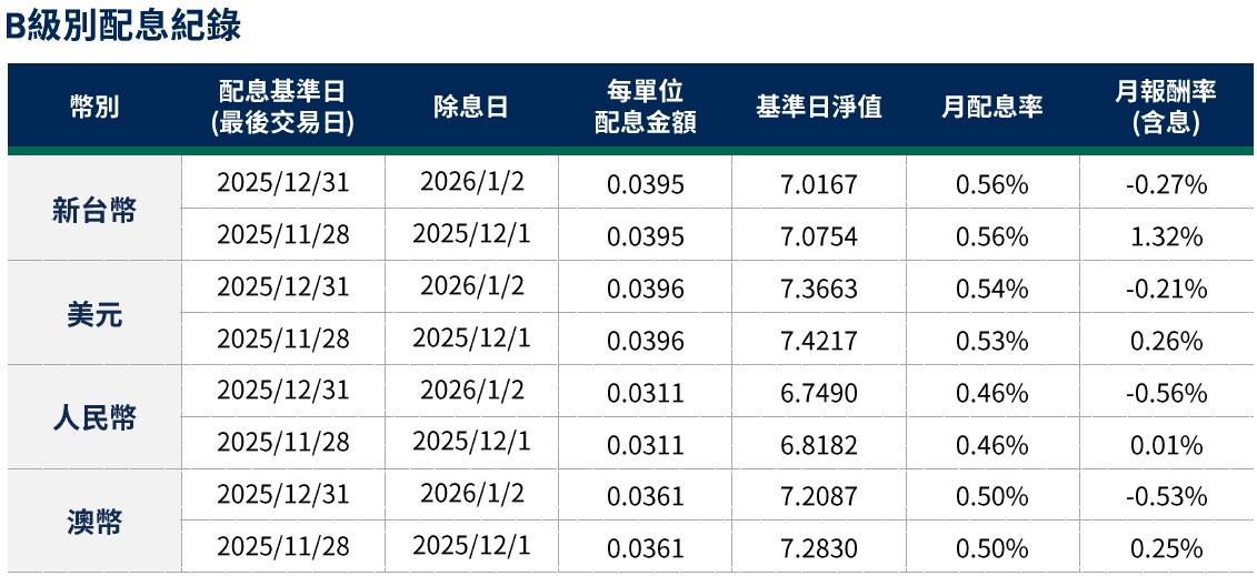 月配息率=(每單位配息金額÷除息日前一日淨值)×100%。月報酬率(含息)=(月底淨值-上月底淨值+上月配息金額)÷上月底淨值。舉凡成立第一個月配息者,該次「月報酬率」欄係指成立日至該月底之報酬率。資料來源:柏瑞投信,2026/1。新台幣/美元/人民幣/澳幣計價。所列日期僅供參考,詳細以相關公告資訊為主,如有更改以基金公司最新公佈為準。基金配息不代表基金實際報酬,且過去配息不代表未來配息;基金淨值可能因市場因素而上下波動。積極配息的基金未必適合投資人,請投資前審慎評估。配息政策請詳閱各基金公開說明書;配息組成項目請至公司網站查詢。基金的配息可能由基金的收益或本金支付。任何涉及由本金支出的部分,可能導致原始投資金額減損。基金進行配息前未先扣除應負擔之相關費用。