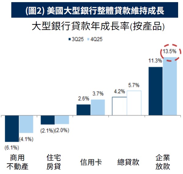 股市未來展望:美國大型銀行財報陸續公布,整體淨利息收入(NII)的展望持續強化,多家銀行預期2026年將有約5%的成長,關鍵的驅動因素之一為貸款維持成長,第四季總貸款年增近6%,其中最主要的成長引擎為企業放款,連續兩季呈雙位數成長,顯示企業庫存調整、資本資出帶來的融資需求提升。