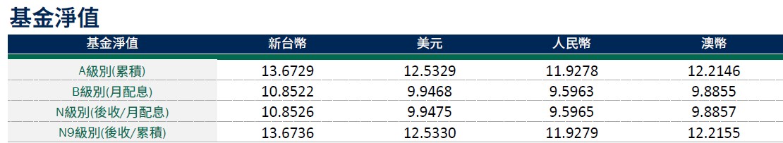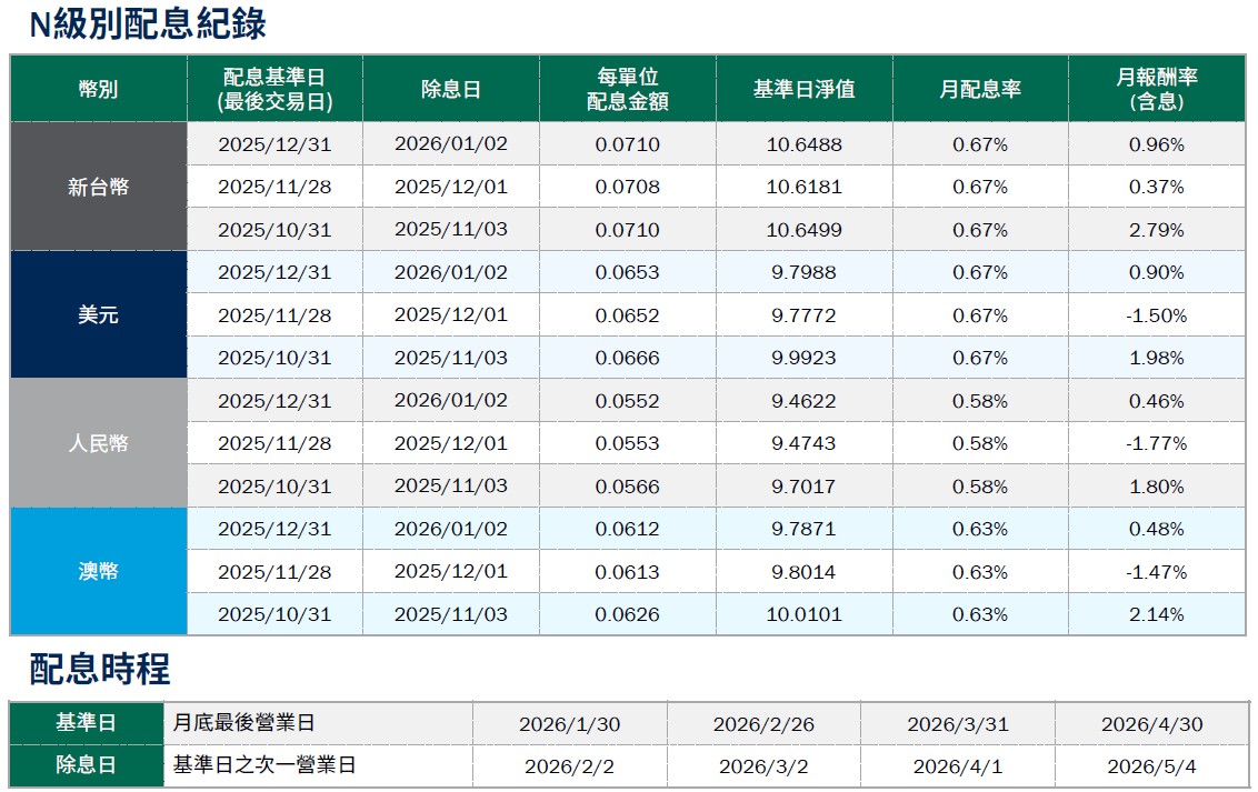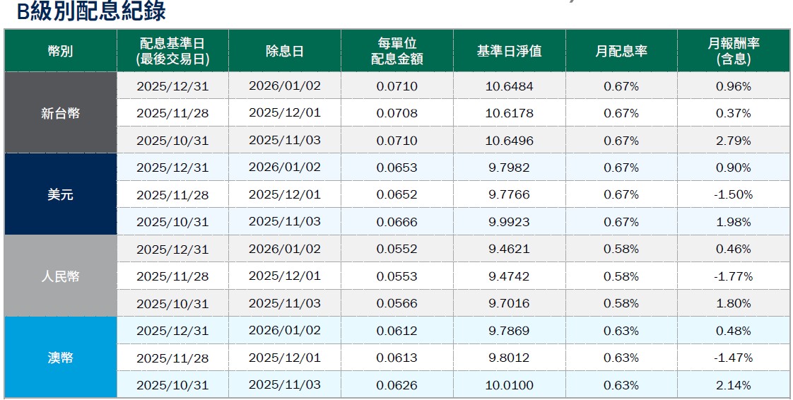 月配息率=(每單位配息金額÷除息日前一日淨值)×100%。 月報酬率(含息)=(月底淨值-上月底淨值+上月配息金額)÷上月底淨值。資料來源:柏瑞投信,2026/1。新台幣/美元/人民幣/澳幣計價。基金配息不代表基金實際報酬,且過去配息不代表未來配息;基金淨值可能因市場因素而上下波動。積極配息的基金未必適合投資人,請投資前審慎評估。配息政策請詳閱各基金公開說明書;配息組成項目請至公司網站查詢。基金的配息可能由基金的收益或本金中支付。任何涉及由本金支出的部份,可能導致原始投資金額減損。基金進行配息前未先扣除應負擔之相關費用。。