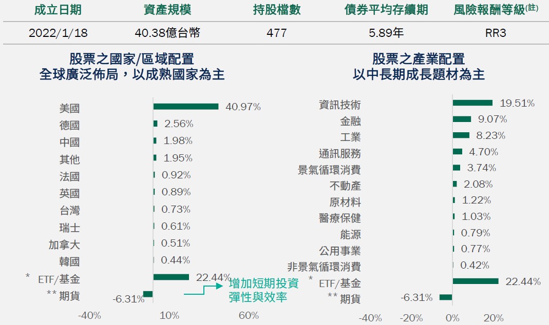 (註):本基金主要投資區域涵蓋全球之股票、債券(如:投資等級債券、非投資等級債券)與基金受益憑證(含ETF)等,未偏重單一市場或產業,基金投資布局係依照投資團隊對各市場及產業投資趨勢判斷,挑出具有投資價值及成長性的資產,再篩選出符合趨勢投資概念的資產,建立投資組合,並動態調整,惟風險無法因分散投資而完全消除,遇相關風險時對基金淨資產價值可能產生較大波動,經計算本基金過去5年淨值波動度(成立未滿5年者,另參考成立以來淨值波動度至內部檢視日),並與同類型基金過去5年淨值波動度及波動度內部參考指數之過去5年波動度相較,爰參酌投信投顧公會「基金風險報酬等級分類標準」,本基金風險報酬等級為RR3*。*風險報酬等級為本公司依照投信投顧公會「基金風險報酬等級分類標準」編製,該分類標準係計算過去5年基金淨值波動度標準差,以標準差區間予以分類等級,分類為RR1-RR5五級,數字越大代表風險越高。此等級分類係基於一般市場狀況反映市場價格波動風險,無法涵蓋所有風險(如:基金計價幣別匯率風險、投資標的產業風險、信用風險、利率風險、流動性風險等),不宜作為投資唯一依據,投資人仍應注意所投資基金個別的風險。請投資人注意申購基金前應詳閱公開說明書,充分評估基金投資特性與風險,更多基金評估之相關資料(如年化標準差、Alpha、Beta及Sharpe值等)可至投信投顧公會網站之「基金績效及評估指標查詢專區」(https://www.sitca.org.tw/index_pc.aspx)查詢。資料來源:柏瑞投信,2026/1/23*中國科技、歐洲金融、商品策略ETF、歐洲金融ETF、REITS ETF、公用事業ETF、新興市場股票基金、日本股票基金、印度股票基金。**日本股票期貨空頭、美國股票期貨空頭、新興市場股票期貨,期貨部位採契約市值佔比,負值係因期貨加空頭部位。投資人應留意衍生性工具 /證券相關商品等槓桿投資策略所可能產生之投資風險(詳見公開說明書)。投資人申購本基金係持有基金受益憑證,而非本文提及之投資資產或標的。配置會隨市況而改變,本公司不另行通知。