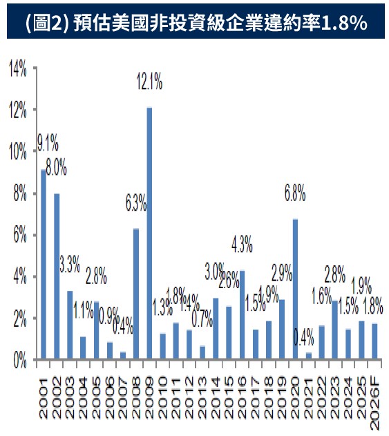 •受惠於美國總體經濟穩健、企業基本面佳及融資管道暢通等因素影響,預期美國非投資等級企業今年違約率約1.8%(圖2),仍低於長期均值。