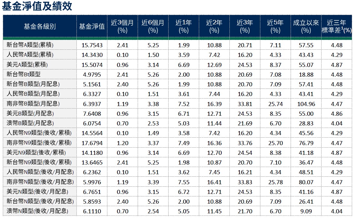 避險比率:新台幣避險比例為43.65%,人民幣級別避險比例 83.51%,澳幣級別避險比例86.50%,南非幣級別避險比例88.19%。