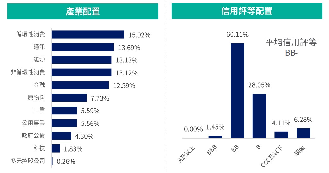 操作說明2:偏好循環性消費、通訊、能源產業;存續期間維持中性,目前3.31年;信用評等聚焦BB與B評級資產,平均信評維持BB-。*(詳見下方註釋)