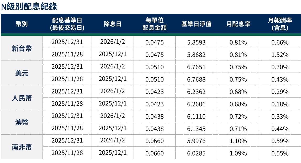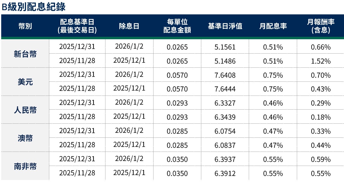 月配息率=(每單位配息金額÷除息日前一日淨值)×100%。 月報酬率(含息)=(月底淨值-上月底淨值+上月配息金額)÷上月底淨值。資料來源:柏瑞投信,2026/1。新台幣/美元/人民幣/澳幣/南非幣計價。基金配息不代表基金實際報酬,且過去配息不代表未來配息;基金淨值可能因市場因素而上下波動。積極配息的基金未必適合投資人,請投資前審慎評估。配息政策請詳閱各基金公開說明書;配息組成項目請至公司網站查詢。基金的配息可能由基金的收益或本金支付。任何涉及由本金支出的部分,可能導致原始投資金額減損。基金進行配息前未先扣除應負擔之相關費用。