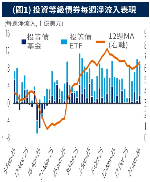 •自2025年4月後投資等級產品持續保持淨流入,截至1月21日當週,ETF累積淨流入74億美元;基金流入17億美元。(圖1)