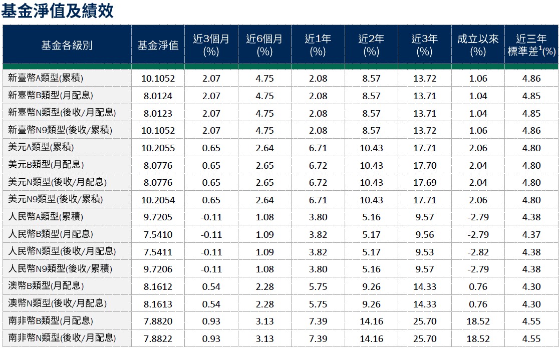 •避險比例:截至12月31日,基金台幣級別避險比例為40.80%,人民幣級別避險比例89.13%,澳幣級別避險比例91.90%,南非幣級別避險比例88.98%。