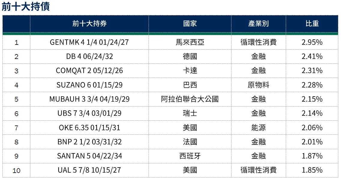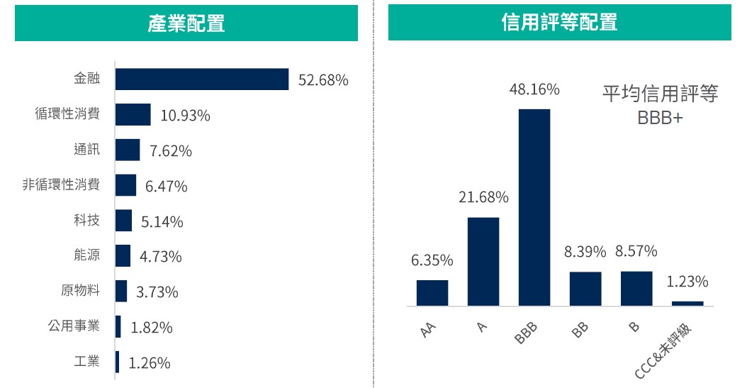 資料來源:柏瑞投信,2025/12/31。配置會隨市況而改變,本公司不另行通知。非投資等級債券仍有相關風險,請投資前審慎評估風險承受度。 *平均殖利率係假設基金投資組合中各債券持有至到期所獲得的收益,包括各期利息收入的再投資。相當於按當前(計算日)市場價格購買並且一直持有到滿期時可獲得的年均報酬率。基金平均殖利率會隨著個別債券價格或票息等因素變動,不代表基金實質報酬率及未來走勢。本基金之投資組合平均信評計算方式:先依公開說明書定義,將標的分類為投資等級或非投資等級,在該分類下,若同一標的有多家信評公司給予不同信評時,按高低順序取最高信評。將個別債券按上述方式定義之信評等級,參酌其相對應之評分(例如:AAA為1分、AA+為2分,依此類推),並依標的市值佔淨資產價值之比重(包含現金),加權平均後無條件捨去,以此數值結果對應信評評分等級,及自投資組合確立後依投資標的信評揭示相關比重。投資人申購本基金係持有基金受益憑證,而非本文提及之投資資產或標的。