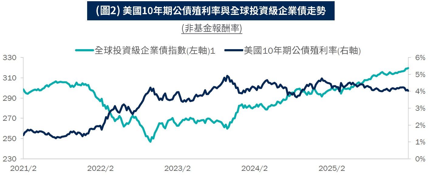 •美國投資等級債利差可能波動:今年以來美國投資等級債利差走勢不明朗,近期因國內資金流減少與亞洲新年影響,供需雙雙收斂。未來數週關稅議題可能反覆,對債券資產形成壓力 (圖1)。