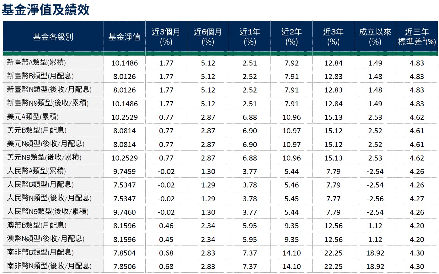 •避險比例:截至1月31日,基金台幣級別避險比例為40.71%,人民幣級別避險比例91.00%,澳幣級別避險比例87.07%,南非幣級別避險比例90.30%。