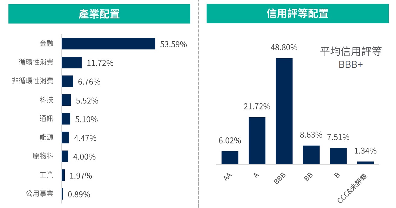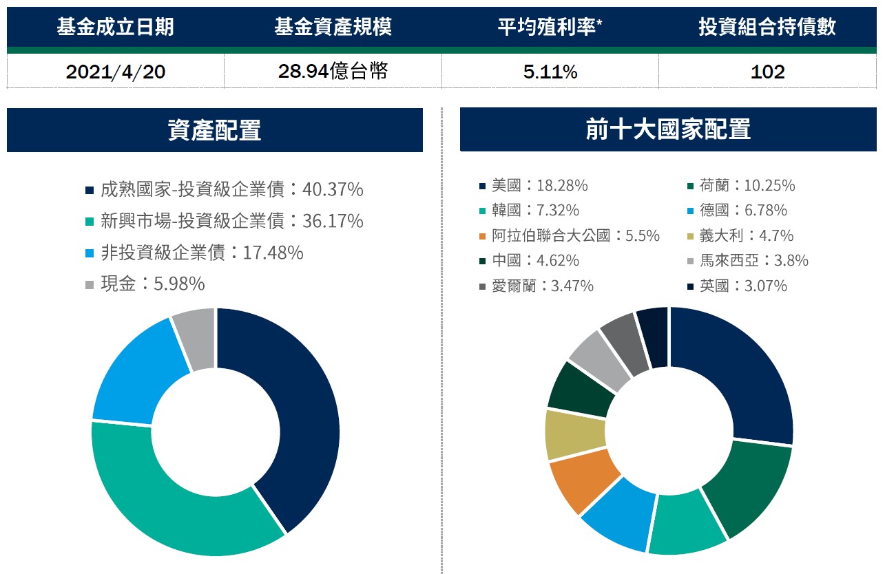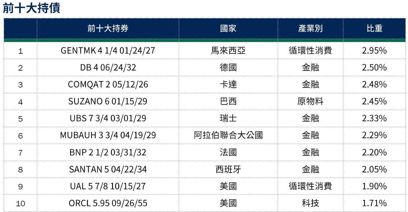 資料來源:柏瑞投信,2026/1/31。配置會隨市況而改變,本公司不另行通知。非投資等級債券仍有相關風險,請投資前審慎評估風險承受度。 *平均殖利率係假設基金投資組合中各債券持有至到期所獲得的收益,包括各期利息收入的再投資。相當於按當前(計算日)市場價格購買並且一直持有到滿期時可獲得的年均報酬率。基金平均殖利率會隨著個別債券價格或票息等因素變動,不代表基金實質報酬率及未來走勢。本基金之投資組合平均信評計算方式:先依公開說明書定義,將標的分類為投資等級或非投資等級,在該分類下,若同一標的有多家信評公司給予不同信評時,按高低順序取最高信評。將個別債券按上述方式定義之信評等級,參酌其相對應之評分(例如:AAA為1分、AA+為2分,依此類推),並依標的市值佔淨資產價值之比重(包含現金),加權平均後無條件捨去,以此數值結果對應信評評分等級,及自投資組合確立後依投資標的信評揭示相關比重。投資人申購本基金係持有基金受益憑證,而非本文提及之投資資產或標的。