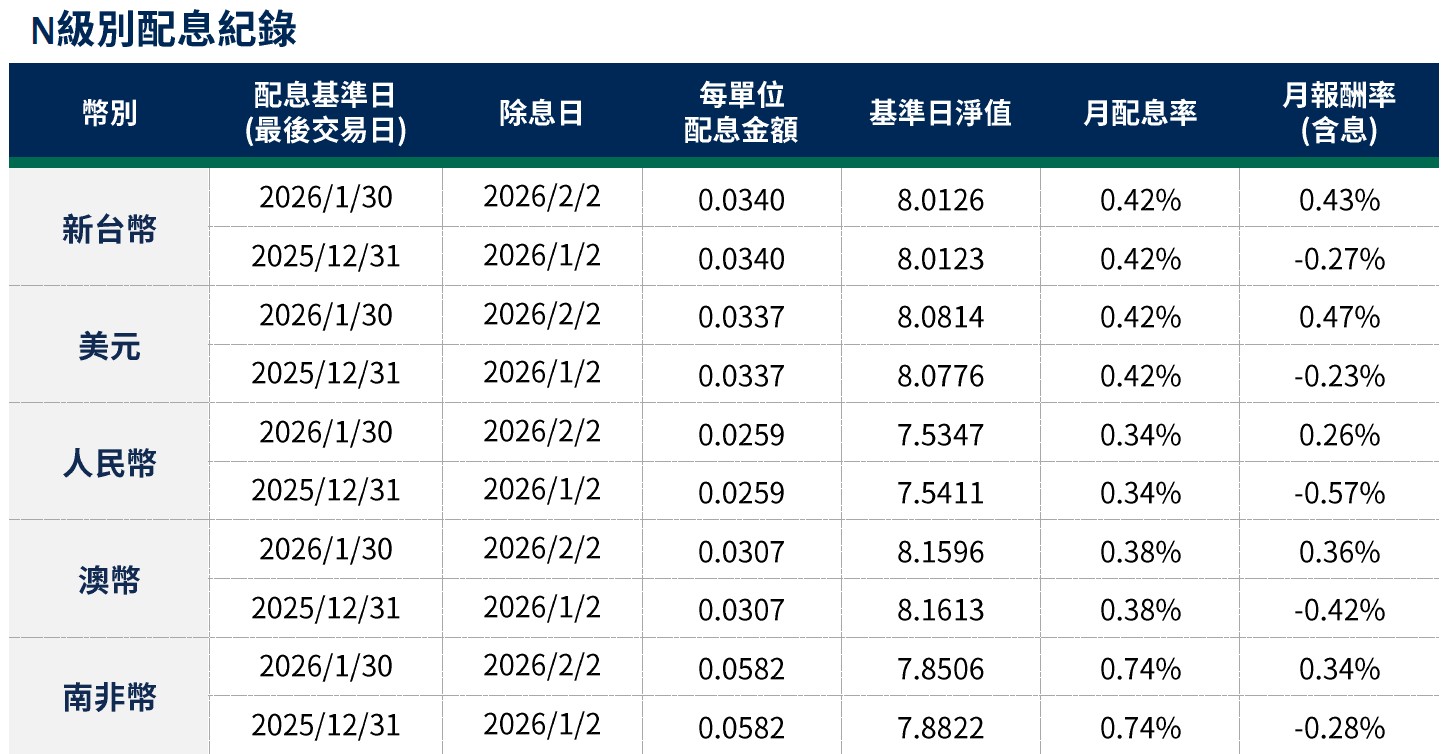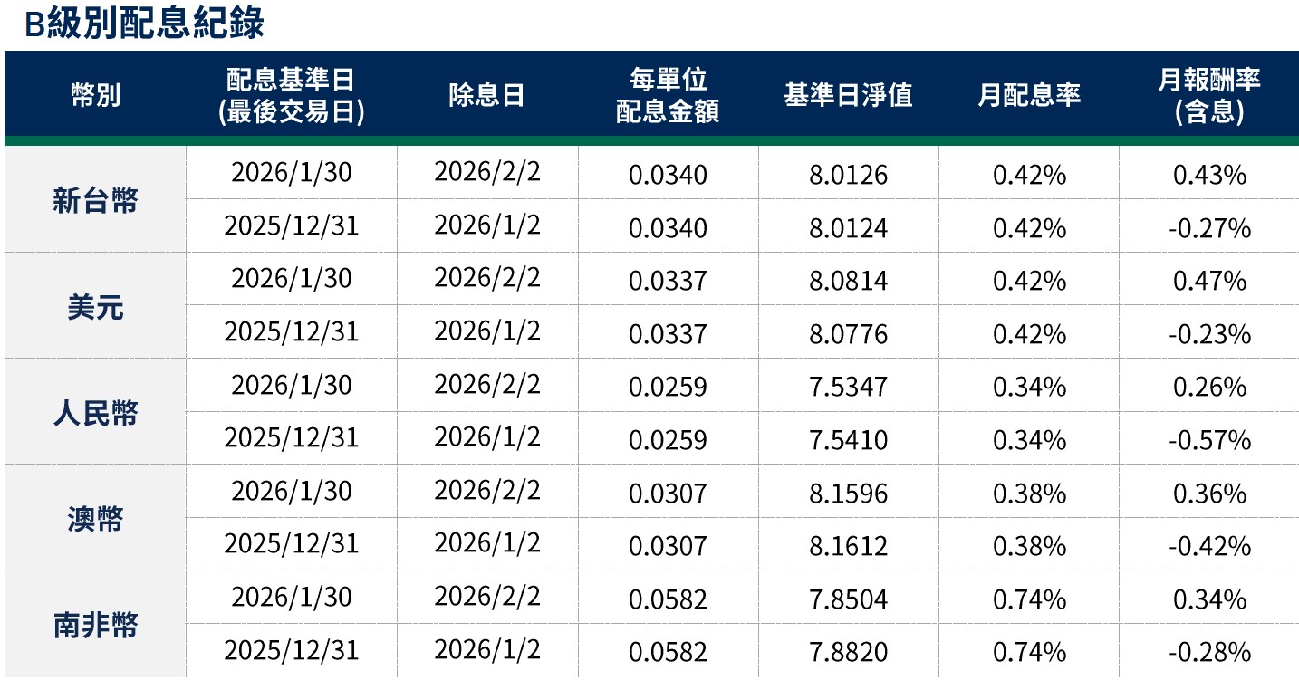 月配息率=(每單位配息金額÷除息日前一日淨值)×100%。 月報酬率(含息)=(月底淨值-上月底淨值+上月配息金額)÷上月底淨值。資料來源:柏瑞投信,2026/2。新台幣/美元/人民幣/澳幣/南非幣計價。基金配息不代表基金實際報酬,且過去配息不代表未來配息;基金淨值可能因市場因素而上下波動。積極配息的基金未必適合投資人,請投資前審慎評估。配息政策請詳閱各基金公開說明書;配息組成項目請至公司網站查詢。基金的配息可能由基金的收益或本金支付。任何涉及由本金支出的部分,可能導致原始投資金額減損。基金進行配息前未先扣除應負擔之相關費用。