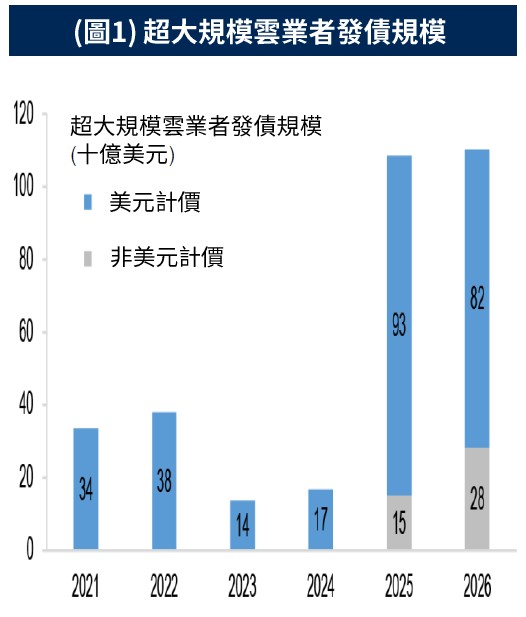 •發行供給放緩有助信用利差穩定:近期投等債發行量近歷史高檔,但3月中累計發行已達1,630億美元,其中以大規模雲業者為主要發債者(圖1),然市場預計未來供給將逐步放緩,這也使供需重新回歸平衡,有助於市場吸收籌碼並維持信用利差穩定。