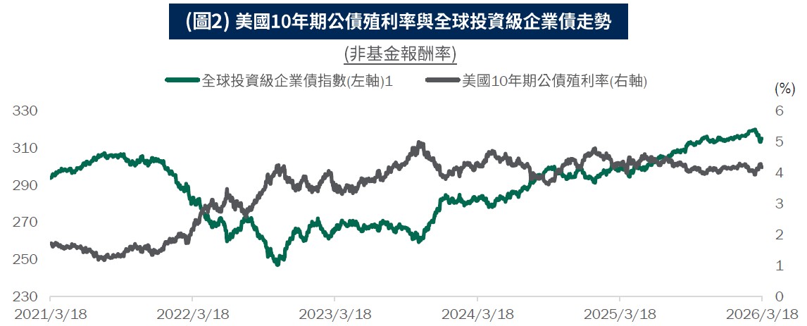 •Fed政策預期仍為市場關鍵支撐:地緣政治風險持續影響債市,但更關鍵的指標在於聯準會政策指引。市場目前已將降息預期由原先的兩次下修至一次。若Fed於此次會議釋出明確訊號,重申下一步仍偏向降息而非升息,將有助穩定信用利差表現。