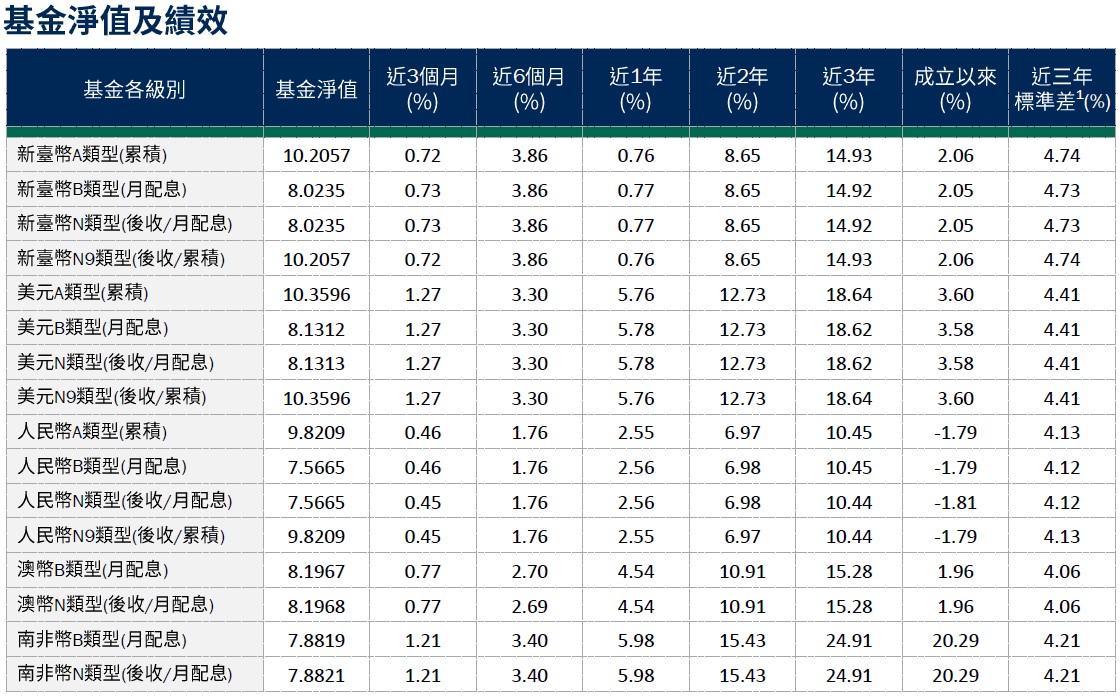 •避險比例:截至2月28日,基金台幣級別避險比例為40.09%,人民幣級別避險比例90.24%,澳幣級別避險比例86.31%,南非幣級別避險比例88.11%。