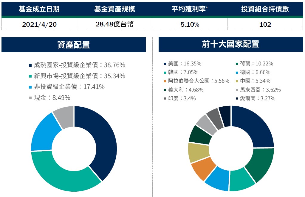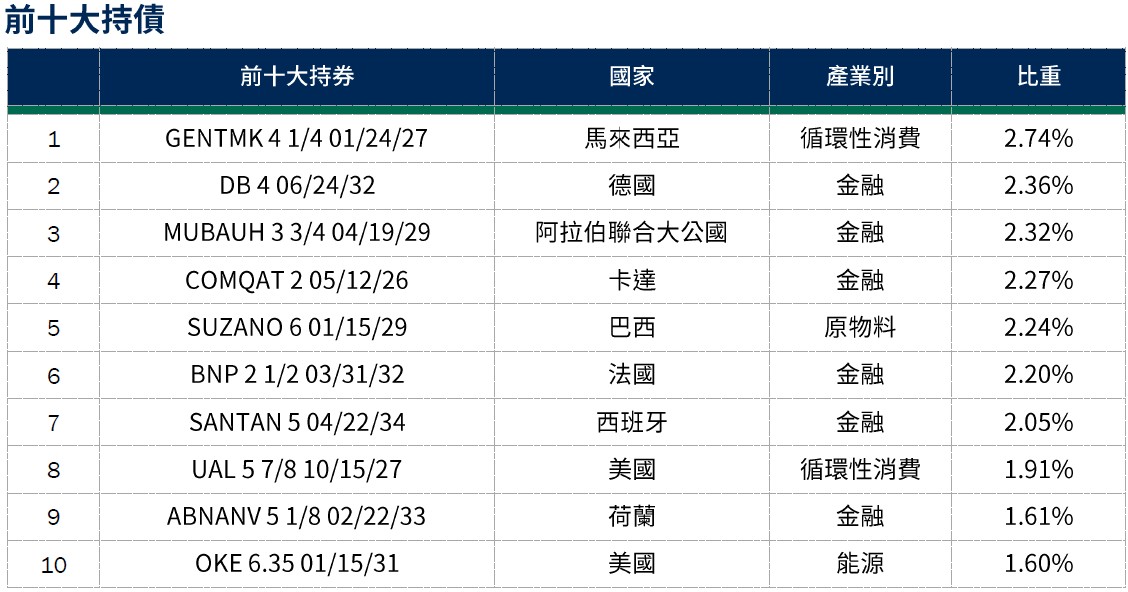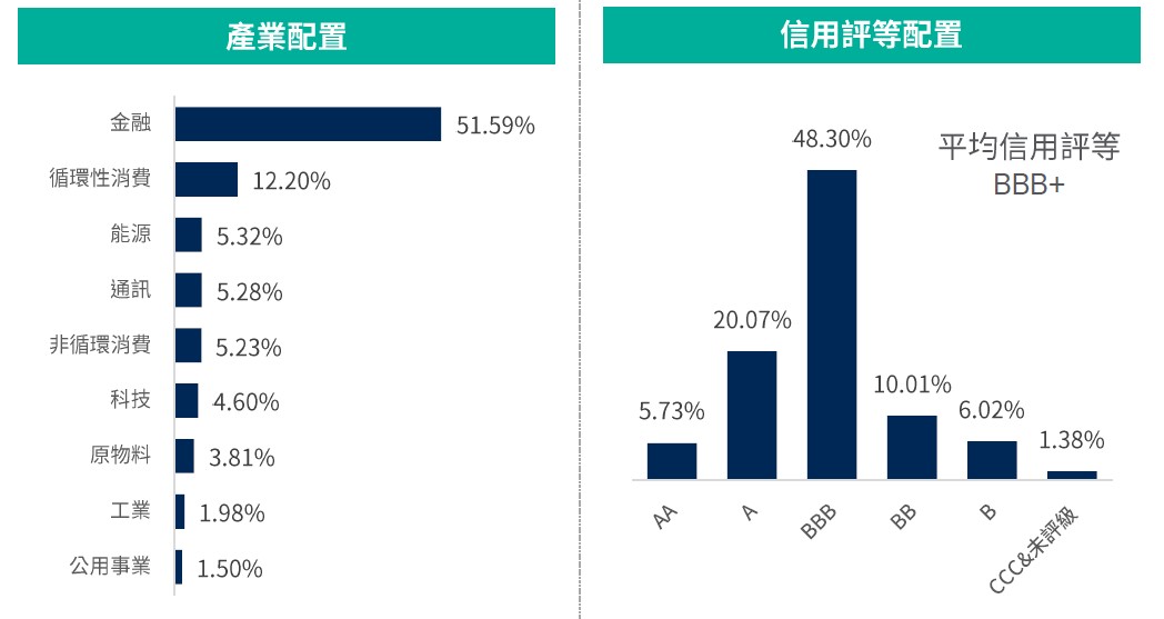 資料來源:柏瑞投信,2026/2/28。配置會隨市況而改變,本公司不另行通知。非投資等級債券仍有相關風險,請投資前審慎評估風險承受度。 *平均殖利率係假設基金投資組合中各債券持有至到期所獲得的收益,包括各期利息收入的再投資。相當於按當前(計算日)市場價格購買並且一直持有到滿期時可獲得的年均報酬率。基金平均殖利率會隨著個別債券價格或票息等因素變動,不代表基金實質報酬率及未來走勢。本基金之投資組合平均信評計算方式:先依公開說明書定義,將標的分類為投資等級或非投資等級,在該分類下,若同一標的有多家信評公司給予不同信評時,按高低順序取最高信評。將個別債券按上述方式定義之信評等級,參酌其相對應之評分(例如:AAA為1分、AA+為2分,依此類推),並依標的市值佔淨資產價值之比重(包含現金),加權平均後無條件捨去,以此數值結果對應信評評分等級,及自投資組合確立後依投資標的信評揭示相關比重。投資人申購本基金係持有基金受益憑證,而非本文提及之投資資產或標的。