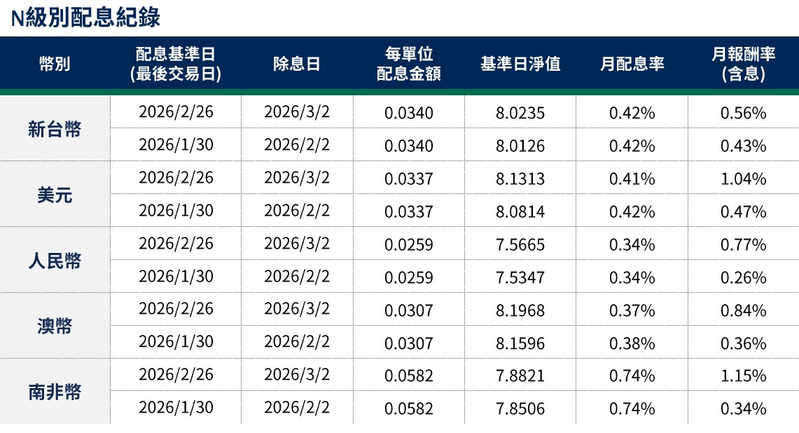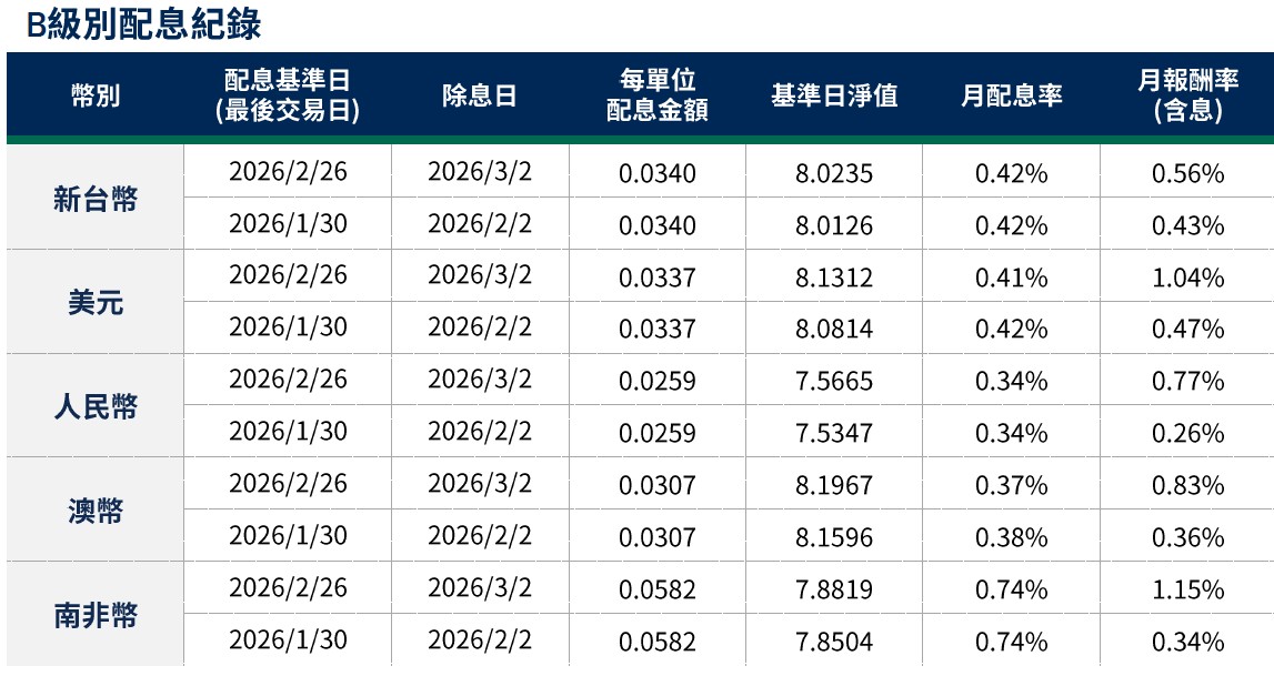 月配息率=(每單位配息金額÷除息日前一日淨值)×100%。 月報酬率(含息)=(月底淨值-上月底淨值+上月配息金額)÷上月底淨值。資料來源:柏瑞投信,2026/3。新台幣/美元/人民幣/澳幣/南非幣計價。基金配息不代表基金實際報酬,且過去配息不代表未來配息;基金淨值可能因市場因素而上下波動。積極配息的基金未必適合投資人,請投資前審慎評估。配息政策請詳閱各基金公開說明書;配息組成項目請至公司網站查詢。基金的配息可能由基金的收益或本金支付。任何涉及由本金支出的部分,可能導致原始投資金額減損。基金進行配息前未先扣除應負擔之相關費用。