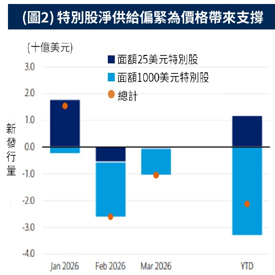 技術面支撐特別股:年初迄今特別股市場呈現淨贖回;大型銀行仍為主要發行方,目前僅花旗同時在機構與零售市場推出新券。展望未來數月,機構預期特別股贖回量可能增加,在需求維持強勁的情況下,供給面趨緊可望為價格形成支撐 (圖2)。