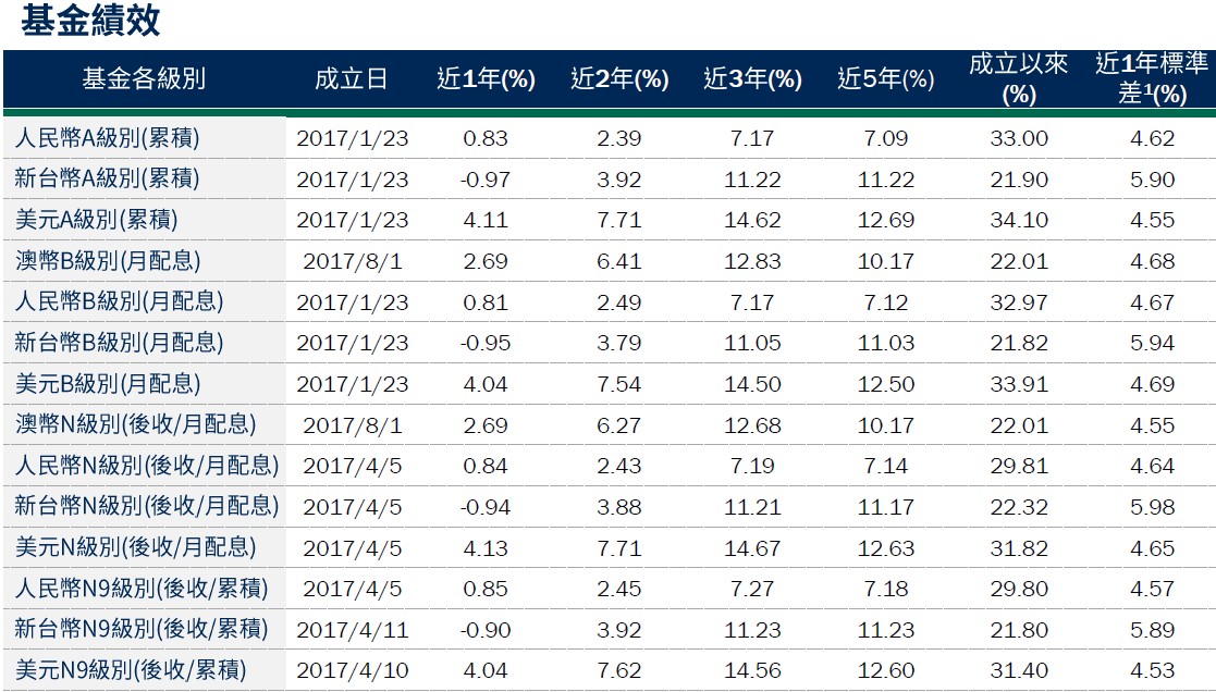 投組概況:截至2026/3/20,本基金投資組合的殖利率*(詳見第3頁註釋)約7.01%,現金部位0.70%;台幣級別避險比例47.63%,人民幣級別避險比例94.11%,澳幣級別避險比例95.87%,日幣級別避險比例38.20%。