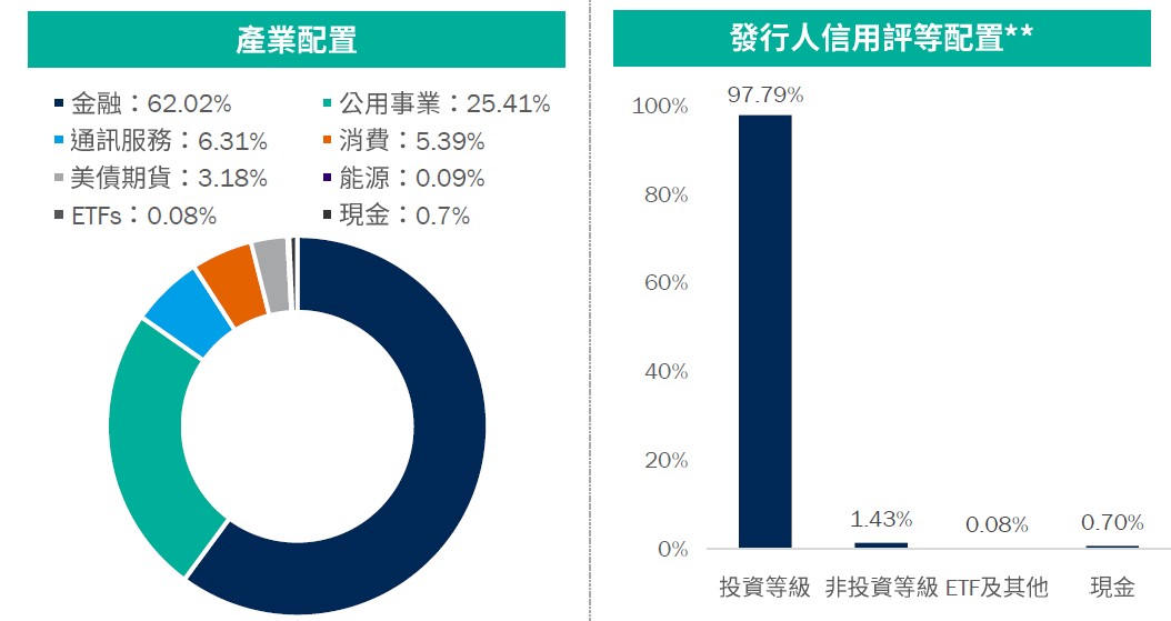 資料來源:柏瑞投信,2026/3/20。配置會隨市況而改變,本公司不另行通知。*註:投資組合殖利率採當期殖利率(Current Yield),計算方式為加權平均特別股及債券的票息除以價格;ETF及REIT則使用12個月股利率。因小數點後位數四捨五入之故,總和可能不完全等於100.0%。**以上信評係指有價證券本身,包括上市特別股。基金殖利率會隨著個別債券價格或票息等因素變動,不代表基金實質報酬率及未來走勢。投資人申購本基金係持有基金受益憑證,而非本文提及之投資資產或標的。投資人應留意衍生性工具/證券相關商品等槓桿投資策略所可能產生之投資風險,詳見公開說明書。