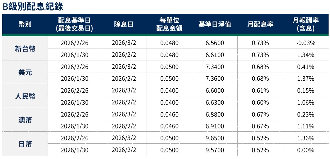 月配息率=(每單位配息金額÷除息日前一日淨值)×100%。 月報酬率(含息)=(月底淨值-上月底淨值+上月配息金額)÷上月底淨值。資料來源:柏瑞投信,2026/3。新台幣/美元/人民幣/澳幣/日幣計價。所列日期僅供參考,詳細以相關公告資訊為主,如有更改以基金公司最新公佈為準。基金配息不代表基金實際報酬,且過去配息不代表未來配息;基金淨值可能因市場因素而上下波動。積極配息的基金未必適合投資人,請投資前審慎評估。配息政策請詳閱各基金公開說明書;配息組成項目請至公司網站查詢。基金的配息可能由基金的收益或本金支付。任何涉及由本金支出的部分,可能導致原始投資金額減損。基金進行配息前未先扣除應負擔之相關費用。