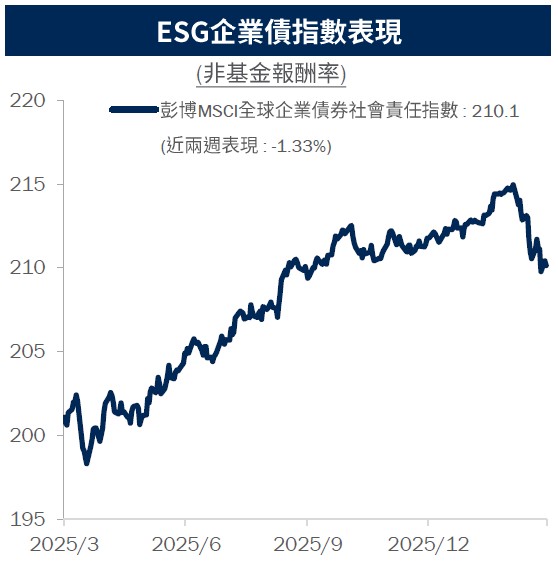 資料來源:Bloomberg,2026/3/24,採用彭博MSCI全球企業債券社會責任指數。圖文與所提及之有價證券僅供參考,此策略不代表絕無風險,本公司未藉此做任何徵求、推薦及獲利之保證。投資人申購本基金係持有基金受益憑證,而非本文提及之投資資產或標的。非基金績效參考指標。 過去績效不代表未來收益之保證。