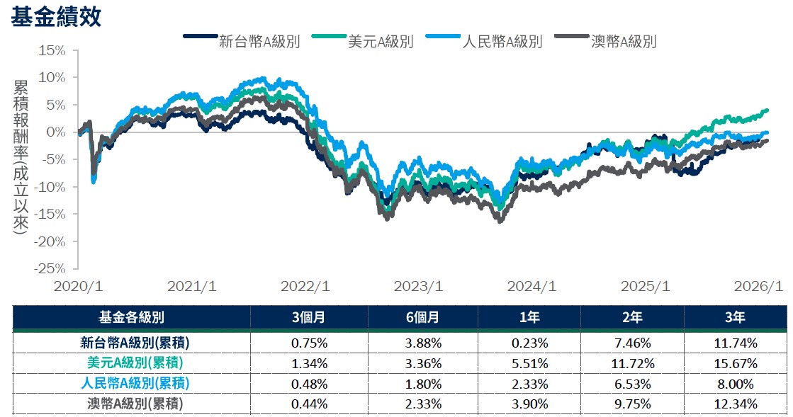 後市展望:美國最高法院裁定川普引用IEEPA 課徵關稅違法後,川普立即援引《1974年貿易法》第122條,宣布15%的全球關稅,令市場再度籠罩於政策不確定性之中。此外,中東戰事似難在短期內結束,能源價格前景成為影響各國貨幣政策變數,短期市場氛圍將偏向謹慎。基金將在波動中適度調整存續期間配置,以期在各區域/國家輪動中掌握投資機會。