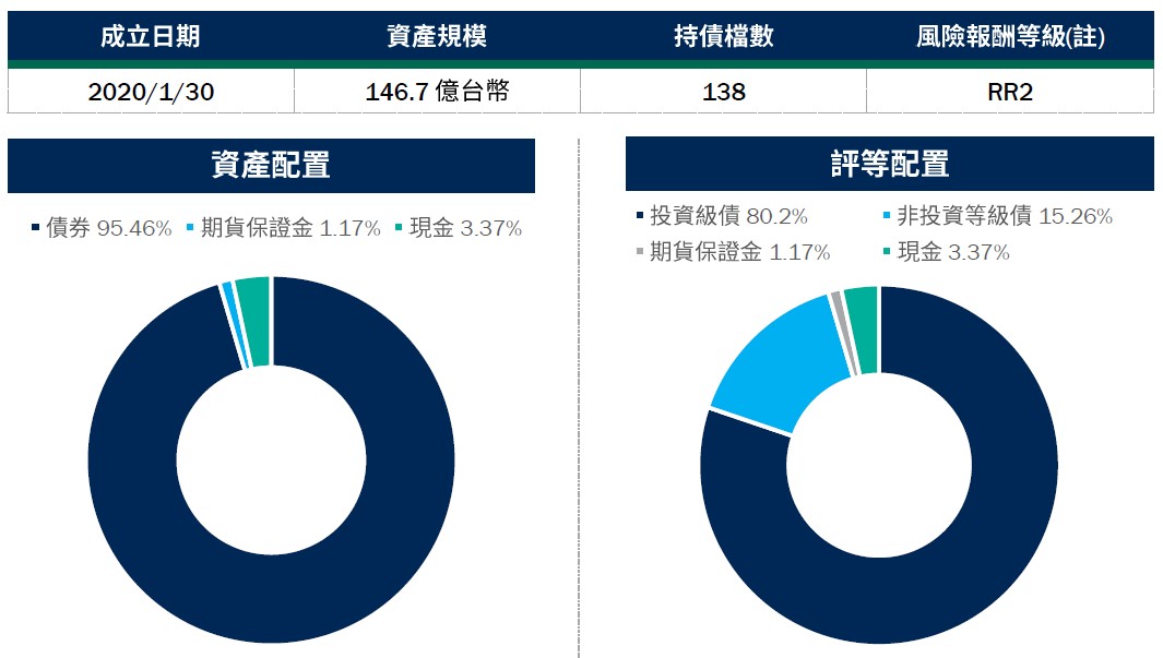 資料來源:柏瑞投信,2026/3/20。現金部位中可能含期貨保證金及國庫券。配置會隨市況而改變,本公司不另行通知。非投資等級債仍有相關風險。基金雖有避險策略,但不代表能完全規避此類匯價波動的風險,避險策略將視市況有所調整。投資人應留意衍生性工具/證券相關商品等槓桿投資策略所可能產生之投資風險,詳見公開說明書。(註):本基金主要投資於全球之投資等級債券,雖以兼顧信用評等優質債券投資機會與ESG投資目標,惟風險無法因分散投資而完全消除,遇相關風險時對基金淨資產價值可能產生較大波動,經計算本基金過去5年淨值波動度(成立未滿5年者,另參考成立以來淨值波動度至內部檢視日),並與同類型基金過去5年淨值波動度及波動度內部參考指數之過去5年波動度相較,爰參酌投信投顧公會「基金風險報酬等級分類標準」,本基金風險報酬等級屬RR2。風險報酬等級為本公司依照投信投顧公會「基金風險報酬等級分類標準」編製,該分類標準係計算過去5年基金淨值波動度標準差,以標準差區間予以分類等級,分類為RR1-RR5五級,數字越大代表風險越高。此等級分類係基於一般市場狀況反映市場價格波動風險,無法涵蓋所有風險(如:基金計價幣別匯率風險、投資標的產業風險、信用風險、利率風險、流動性風險等),不宜作為投資唯一依據,投資人仍應注意所投資基金個別的風險。請投資人注意申購基金前應詳閱公開說明書,充分評估基金投資特性與風險,更多基金評估之相關資料(如年化標準差、Alpha、Beta及Sharpe值等)可至投信投顧公會網站之「基金績效及評估指標查詢專區」(https://www.sitca.org.tw/index_pc.aspx )查詢。投資人申購本基金係持有基金受益憑證,而非本文提及之投資資產或標的。