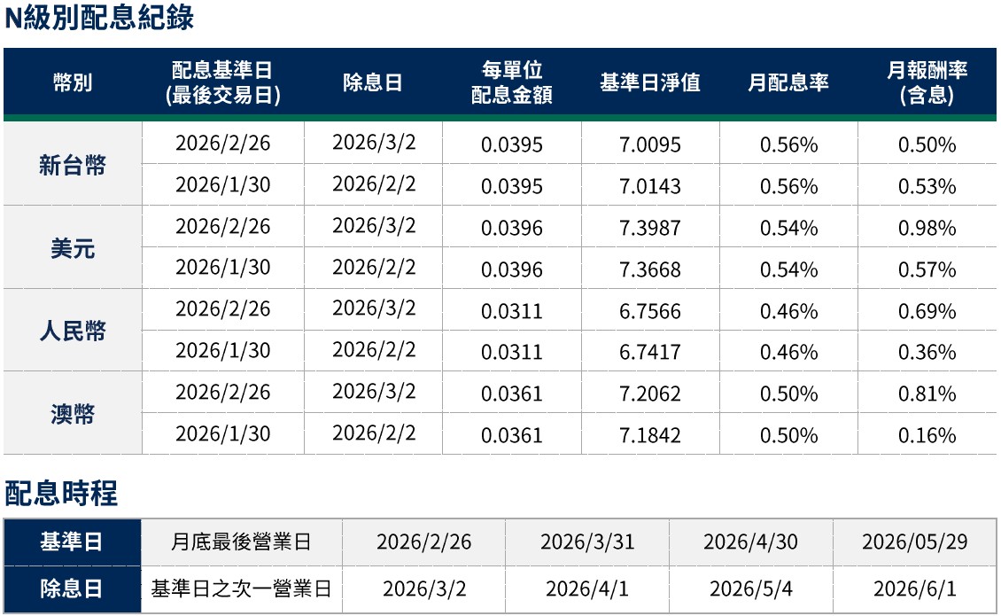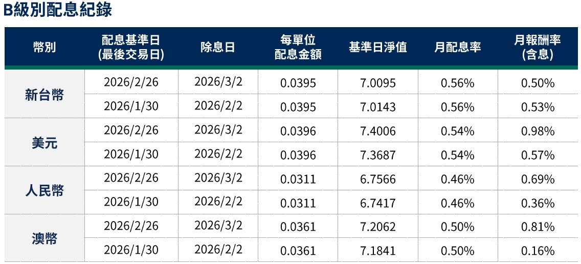 月配息率=(每單位配息金額÷除息日前一日淨值)×100%。月報酬率(含息)=(月底淨值-上月底淨值+上月配息金額)÷上月底淨值。舉凡成立第一個月配息者,該次「月報酬率」欄係指成立日至該月底之報酬率。資料來源:柏瑞投信,2026/3。新台幣/美元/人民幣/澳幣計價。所列日期僅供參考,詳細以相關公告資訊為主,如有更改以基金公司最新公佈為準。基金配息不代表基金實際報酬,且過去配息不代表未來配息;基金淨值可能因市場因素而上下波動。積極配息的基金未必適合投資人,請投資前審慎評估。配息政策請詳閱各基金公開說明書;配息組成項目請至公司網站查詢。基金的配息可能由基金的收益或本金支付。任何涉及由本金支出的部分,可能導致原始投資金額減損。基金進行配息前未先扣除應負擔之相關費用。