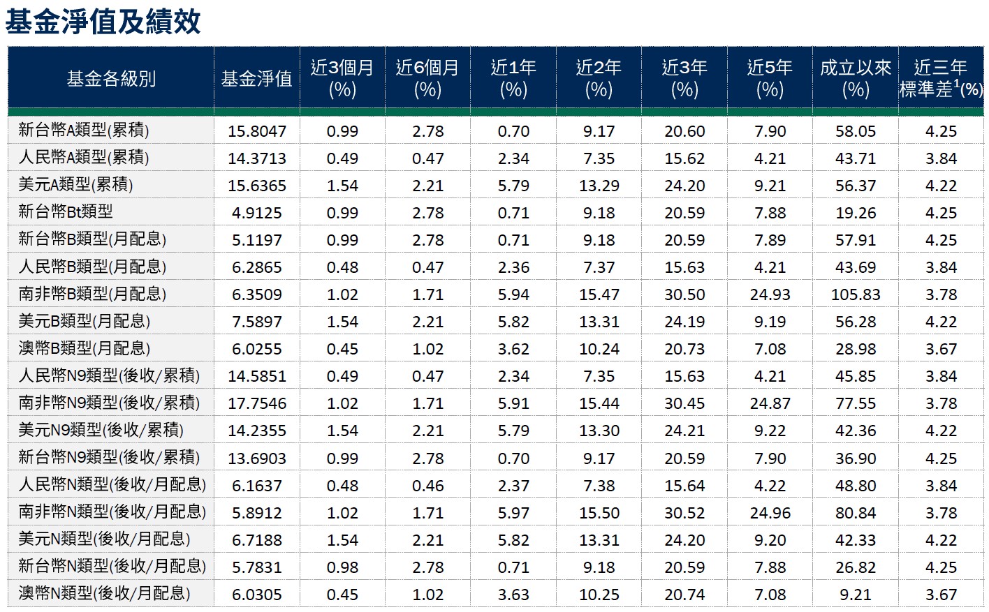 避險比率2:新台幣避險比例為44.19%,人民幣級別避險比例 85.61%,澳幣級別避險比例89.45%,南非幣級別避險比例81.74%。