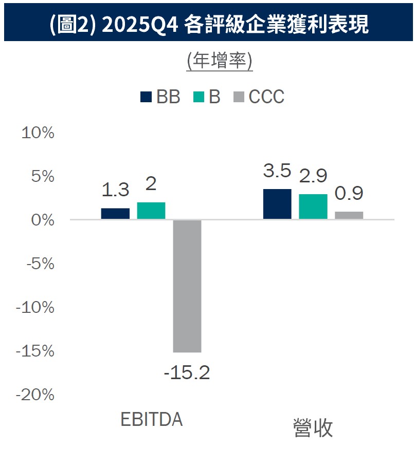 •2025年第四季,美國非投資等級企業獲利與財測指引普遍優於預期。信用評級層面,BB與B級企業的營收與EBITDA年增率表現均明顯優於CCC級企業,顯示較高評級發行人獲利韌性相對較佳。(圖2)