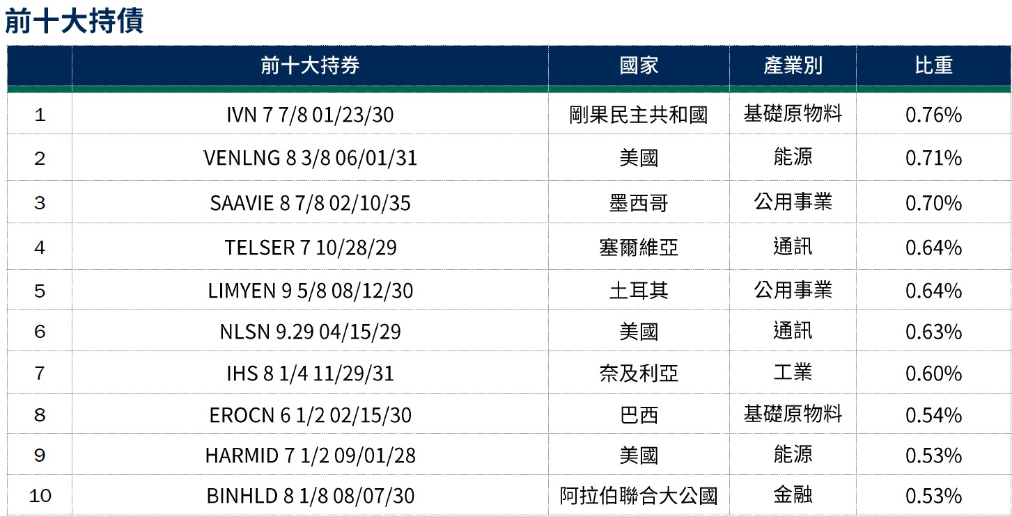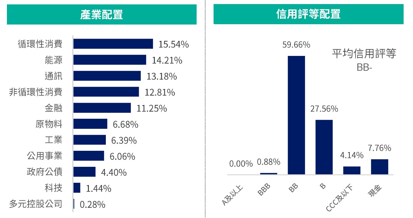 操作說明2:偏好循環性消費、能源、通訊產業;存續期間維持中性,目前3.33年;信用評等聚焦BB與B評級資產,平均信評維持BB-。*(詳見第3頁註釋)