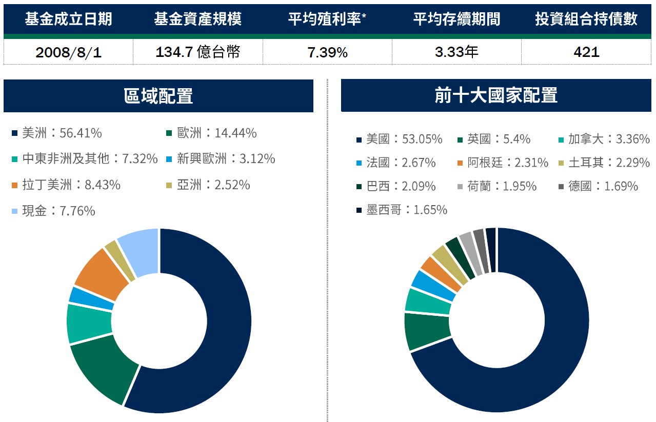 資料來源:柏瑞投信,2026/2/28。配置會隨市況而改變,本公司不另行通知。非投資等級債券仍有相關風險,請投資前審慎評估風險承受度。*平均殖利率係假設基金投資組合中各債券持有至到期所獲得的收益,包括各期利息收入的再投資。相當於按當前(計算日)市場價格購買並且一直持有到滿期時可獲得的年均報酬率。基金平均殖利率會隨著個別債券價格或票息等因素變動,不代表基金實質報酬率及未來走勢。本基金之投資組合平均信評計算方式:先依公開說明書定義,將標的分類為投資等級或非投資等級,在該分類下,若同一標的有多家信評公司給予不同信評時,按高低順序取最高信評。將個別債券按上述方式定義之信評等級,參酌其相對應之評分(例如:AAA為1分、AA+為2分,依此類推),並依標的市值佔淨資產價值之比重(包含現金),加權平均後無條件捨去,以此數值結果對應信評評分等級,及自投資組合確立後依投資標的信評揭示相關比重。