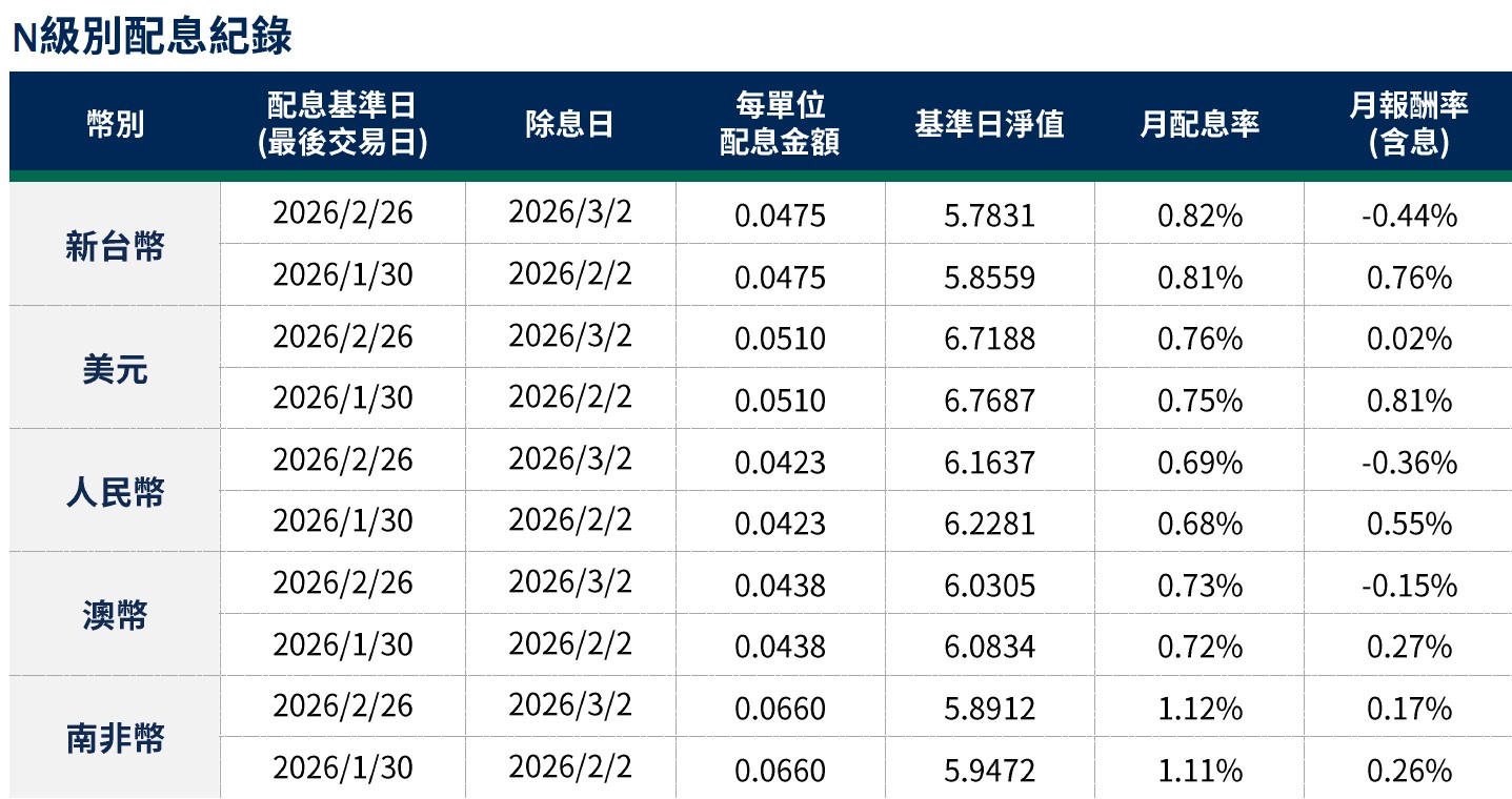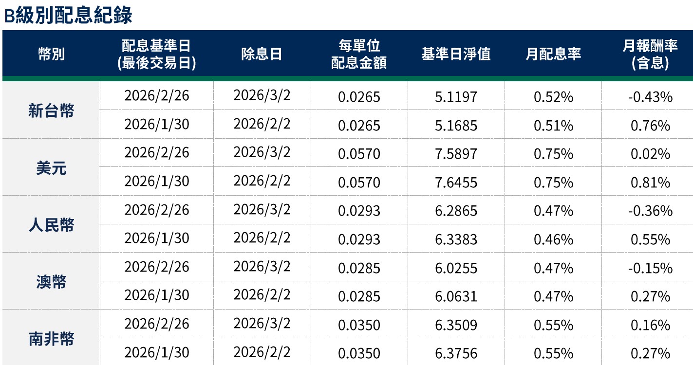 月配息率=(每單位配息金額÷除息日前一日淨值)×100%。 月報酬率(含息)=(月底淨值-上月底淨值+上月配息金額)÷上月底淨值。資料來源:柏瑞投信,2026/3。新台幣/美元/人民幣/澳幣/南非幣計價。基金配息不代表基金實際報酬,且過去配息不代表未來配息;基金淨值可能因市場因素而上下波動。積極配息的基金未必適合投資人,請投資前審慎評估。配息政策請詳閱各基金公開說明書;配息組成項目請至公司網站查詢。基金的配息可能由基金的收益或本金支付。任何涉及由本金支出的部分,可能導致原始投資金額減損。基金進行配息前未先扣除應負擔之相關費用。