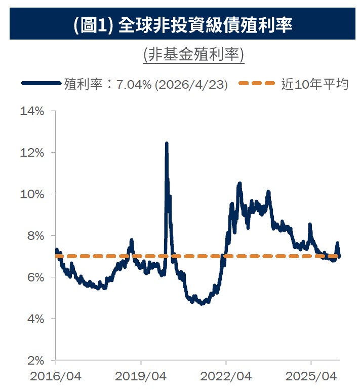 近期非投資級債利差迅速擴張,目前全球非投資級債殖利率約7.04%,略高於10年平均水準。(圖1)