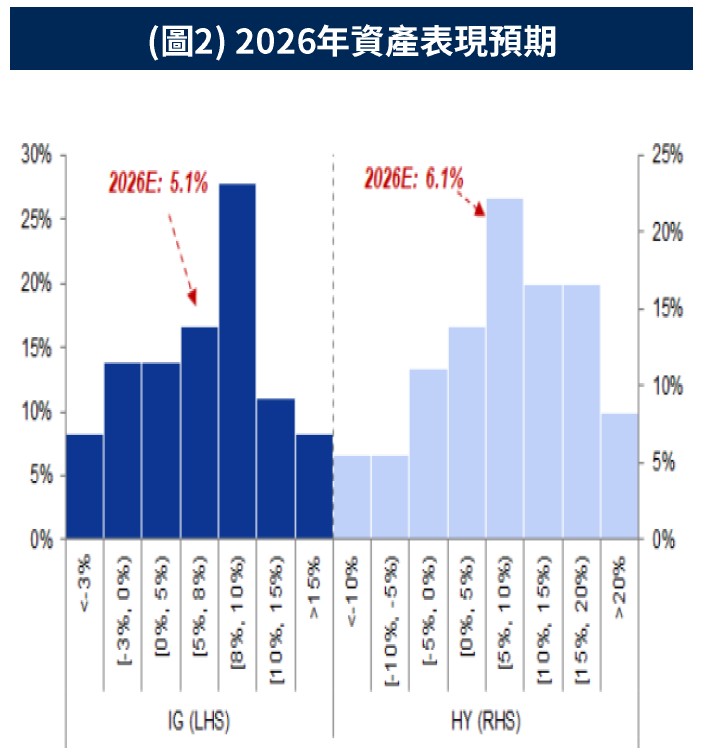3月固定收益資產同時面臨利率上行與信用利差擴大的雙重壓力,導致第一季總報酬表現承壓。然而,當前較高的殖利率水準有望彌補部分跌幅,機構預估2026年非投資等級債全年總報酬約為 6.1% (圖2)