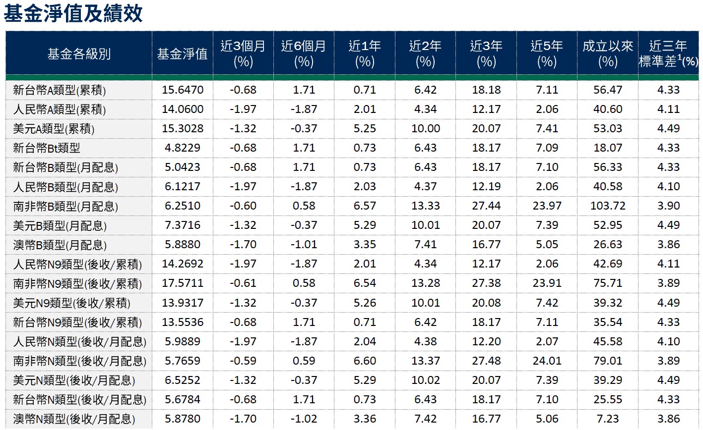 避險比率2:新台幣避險比例為42.57%,人民幣級別避險比例 88.64%,澳幣級別避險比例88.73%,南非幣級別避險比例90.33%。