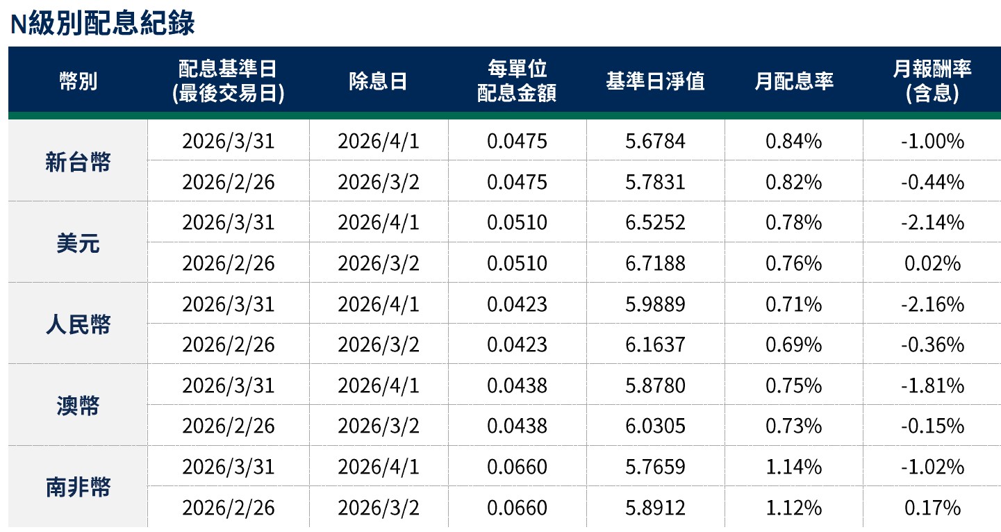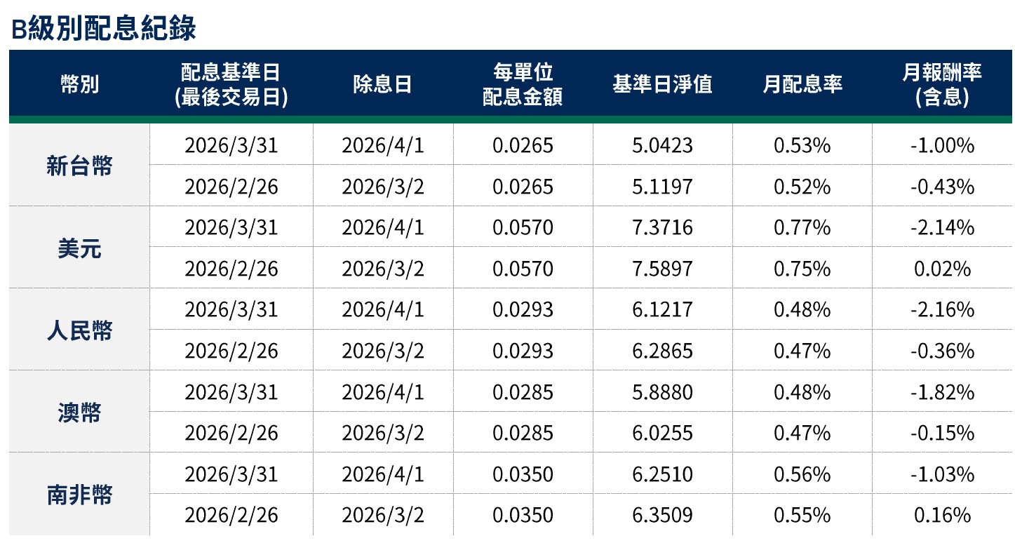 月配息率=(每單位配息金額÷除息日前一日淨值)×100%。 月報酬率(含息)=(月底淨值-上月底淨值+上月配息金額)÷上月底淨值。資料來源:柏瑞投信,2026/4。新台幣/美元/人民幣/澳幣/南非幣計價。基金配息不代表基金實際報酬,且過去配息不代表未來配息;基金淨值可能因市場因素而上下波動。積極配息的基金未必適合投資人,請投資前審慎評估。配息政策請詳閱各基金公開說明書;配息組成項目請至公司網站查詢。基金的配息可能由基金的收益或本金支付。任何涉及由本金支出的部分,可能導致原始投資金額減損。基金進行配息前未先扣除應負擔之相關費用。