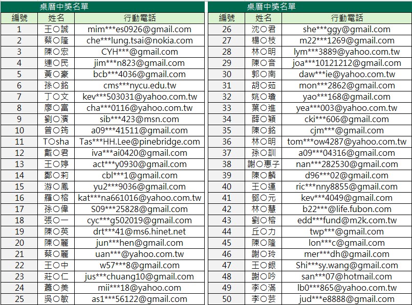 【填寫滿意度問卷,抽2026年限量精美桌曆】活動已圓滿結束,恭喜以下50名幸運兒,將獲得柏瑞投信2026年限量精美桌曆乙份,上述贈品將於2025/12/14以平信方式寄至您於本公司留存的通訊地址,敬請留意您的收件狀況。