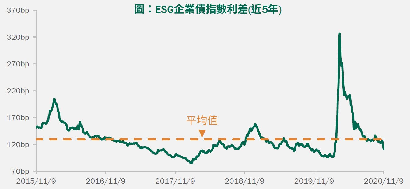圖文僅供參考,本公司無意藉此作任何徵求或推薦。過去績效不代表未來收益之保證。資料來源:Bloomberg,2020/11/9。ESG企業債參考彭博巴克萊MSCI全球企業社會責任債券指數(美元避險),非本基金績效指標。
