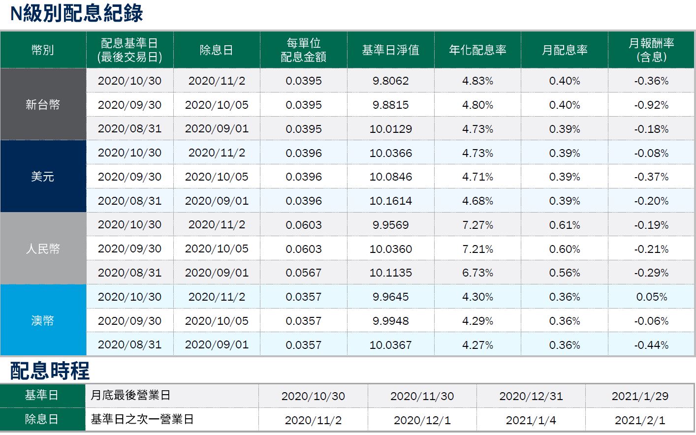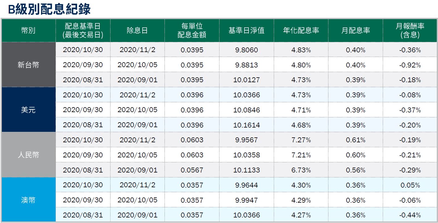 年化配息率=(每單位配息金額÷除息日前一日之淨值×一年配息次數×100%),年化配息率為估算值。月配息率=(每單位配息金額÷除息日前一日淨值)×100%,為年化前之月配息率。月報酬率(含息)=(月底淨值-上月底淨值+上月配息金額)÷上月底淨值。舉凡成立第一個月配息者,該次「月報酬率」欄係指成立日至該月底之報酬率。資料來源:柏瑞投信,2020/11。新台幣/美元/人民幣/澳幣計價。配息率不代表報酬率,積極配息的基金未必適合投資人,請投資前審慎評估。配息政策請詳閱各基金公開說明書;配息組成項目請至公司網站查詢。