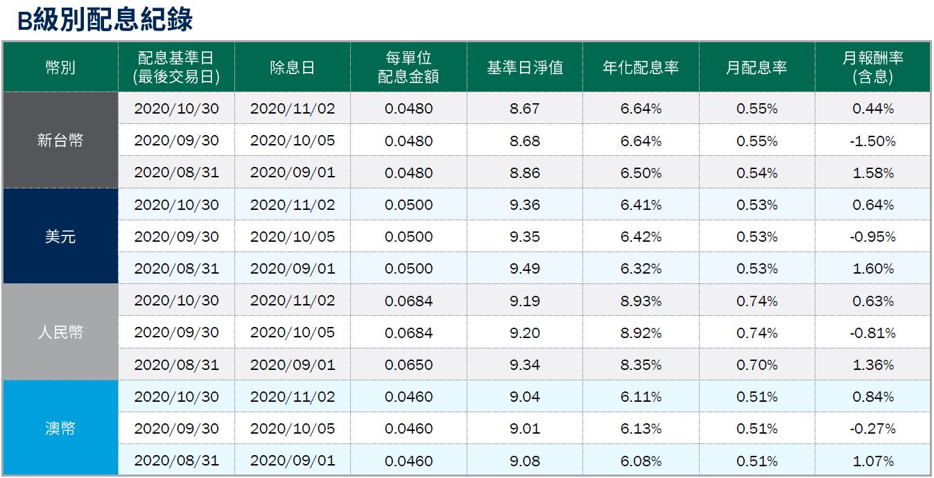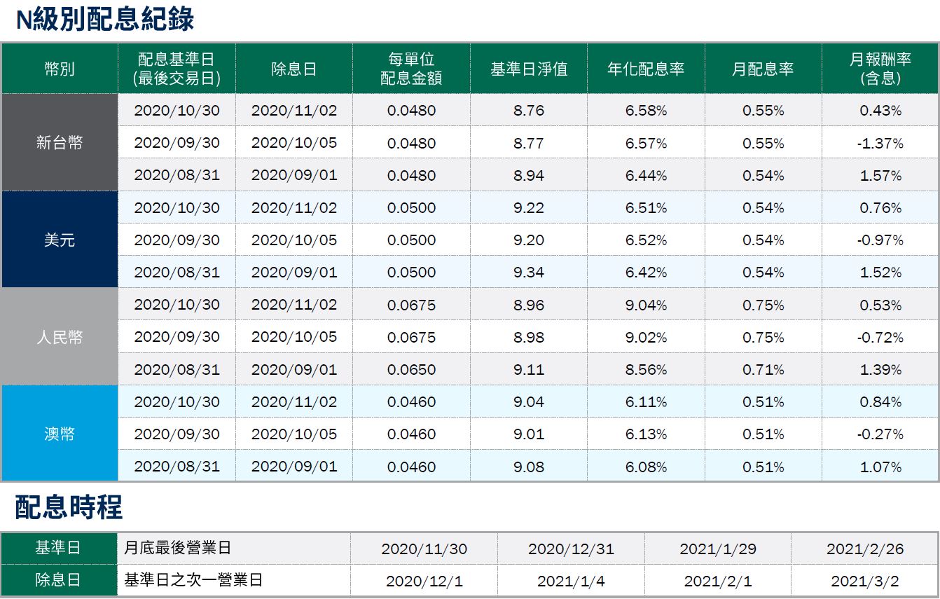 年化配息率=(每單位配息金額÷除息日前一日之淨值×一年配息次數×100%),年化配息率為估算值。月配息率=(每單位配息金額÷除息日前一日淨值)×100%,為年化前之月配息率。 月報酬率(含息)=(月底淨值-上月底淨值+上月配息金額)÷上月底淨值。資料來源:柏瑞投信,2020/11。新台幣/美元/人民幣/澳幣計價。