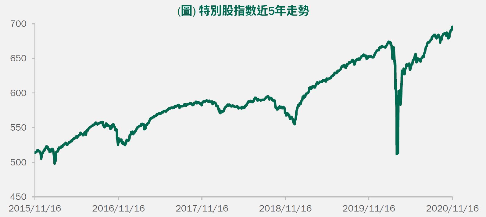 近一週圍繞新冠疫苗積極進展、大型經濟體強勁經濟數據帶來的樂觀情緒,蓋過了新冠病例上升的擔憂。歐美地區的新冠疫情嚴峻,美國部分城市又再度重啟防疫措施,日韓等地也正在出現第三波疫情;不過投資人更聚焦於新冠疫苗有望問世、以及企業財報的強勁表現,而中國及日本等兩大經濟體亮眼的經濟數據也助長了市場的樂觀情緒。然而聯準會主席Powell仍示警,新冠疫情正在蔓延、短期風險依然存在,並重申政府及聯準會可能需要採取更多行動以支撐經濟;歐洲央行總裁Lagarde則表示,疫苗讓新冠危機的結束出現曙光,但現在宣布勝利仍為時過早。美中關係部分,美國政府禁止美國投資由中國軍方擁有或控制的企業,且有報導指出Trump計劃在未來幾週對中國採取系列行動,雙方關係的發展於選後再度浮上新聞版面。對於新冠疫苗的憧憬及經濟復甦的預期,提振了風險性資產近一週的表現,然而由於疫苗不太能改變疫情在嚴冬肆虐的局面,且美國政權尚未順利移轉,加上英國脫歐談判再度走到棘手的關口等,皆讓部分投資人保持謹慎,美國10年期公債殖利率小幅回落至0.9061%;特別股指數則維持其穩健走勢,近一週再上漲0.75%(圖)。