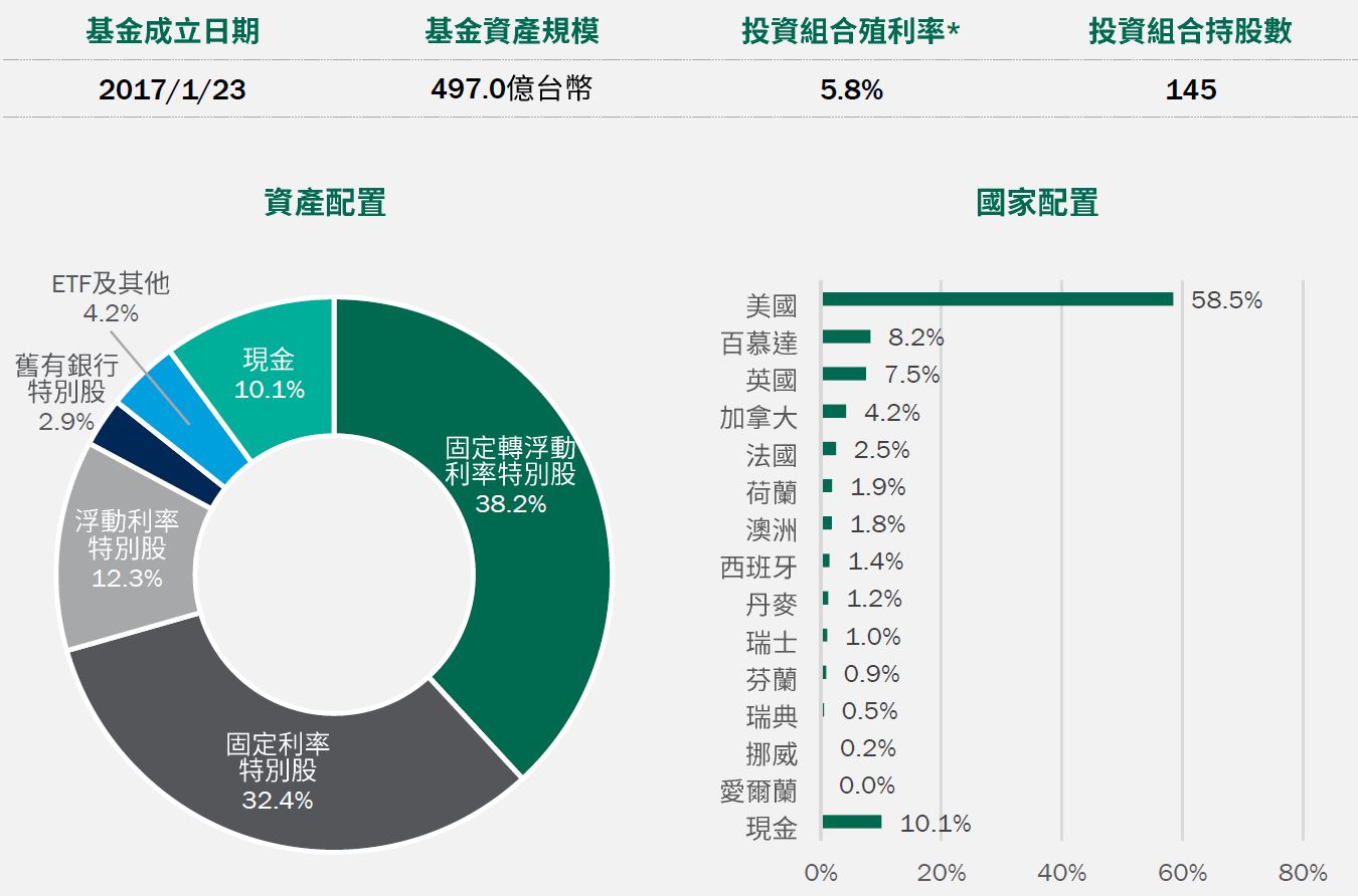 *註:投資組合殖利率採當期殖利率(Current Yield),計算方式為加權平均特別股及債券的票息除以價格;ETF及REIT則使用12個月股利率。基金殖利率會隨著個別債券價格或票息等因素變動,不代表基金實質報酬率及未來走勢。