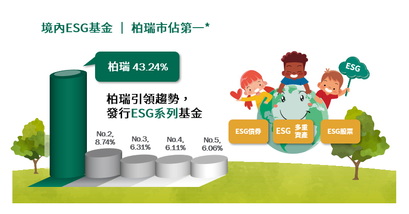 柏瑞投信引領趨勢,發行5檔ESG系列產品,市佔境內第一*,達43.24%。產品線多元,囊括股票、債券、多重資產型基金,涵蓋各種投資需求。建議以定期定額方式分批進場,掌握ESG中長線趨勢商機,6月底前享定期定額*終身0%手續費優惠,長期投資最划算。