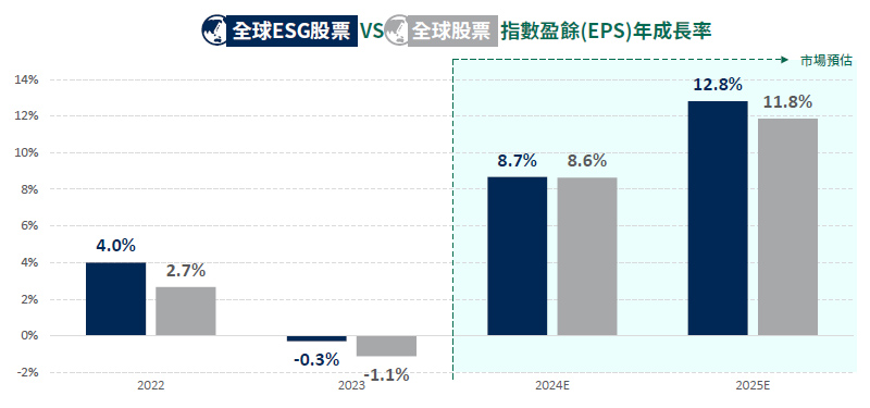 全球ESG股票參考MSCI ACWI ESG Leaders指數,全球股票參考MSCI ACWI World指數。以美元為計算基礎,2024年與2025年為Bloomberg統計市場預估值。採用未來12個月每股預估盈餘。資料來源:Bloomberg,柏瑞投信整理,2024/5/8。圖文僅供參考,本公司未藉此作任何徵求、推薦及獲利之保證。此頁指數非基金之績效指標。投資人申購本基金係持有基金受益憑證,而非本文提及之投資資產或標的。過去績效不代表未來收益之保證。