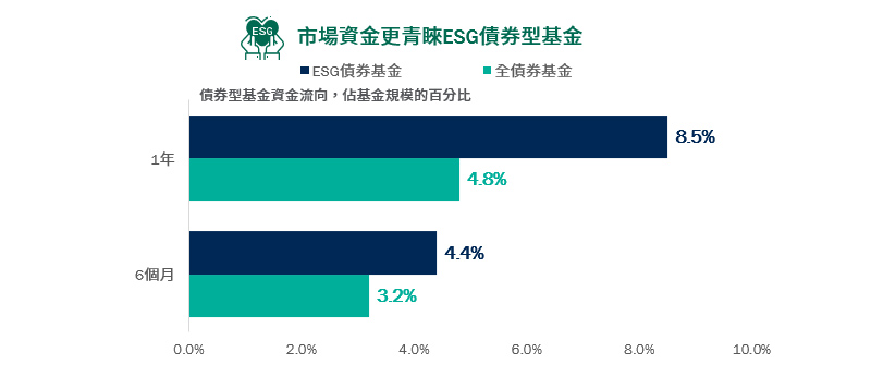 近年ESG相關議題持續發酵,隨著各國政府積極因應趨勢制定企業的ESG揭露規範、碳稅費徵收標準等相關法規,企業界也從善如流調整並訂定相關經營方針,且伴隨ESG議題重視程度及法規成熟度的提升,ESG相關基金數量也逐漸增加,相較全債券基金,ESG債券基金有望吸引資金流入。