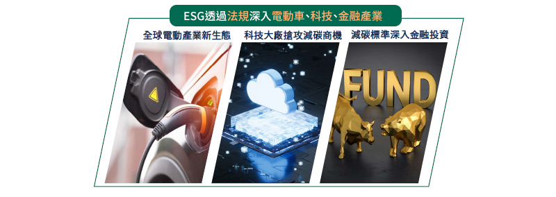 隨著ESG法規如火如荼訂定,帶動全球產業大變革,包含電動車、科技大廠及金融產業都在搶攻減碳商機,ESG不再只是紙上談兵,而是長期能產生影響力的投資趨勢。