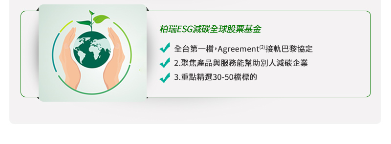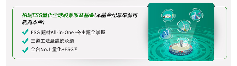 資料來源:柏瑞投信整理,2024/7/31。圖文僅供參考,本公司未藉此作任何徵求、推薦及獲利之保證。投資人申購本基金係持有基金受益憑證,而非本文提及之投資資產或標的。本基金雖有避險策略,但不保證完全規避匯率風險,實際仍將隨市況波動與市場看法進行調整。(1)台灣No.1 首發ESG全球股票基金係根據SITCA分類,境內全球股票型基金分類中符合ESG投資逾70%、且採取量化策略操作之股票基金,柏瑞為第一檔首發,2021/12/31。註:本基金成立6個月後,應有至少70%價值之部位投資於符合ESG投資概念之有價證券。符合ESG投資概念之相關定義說明請詳閱公開說明書。(2)此指巴黎協定,是由聯合國195個成員國於2015年12月12日在聯合國氣候峰會上通過的氣候協議。本基金設有ESG績效指標為MSCI全球巴黎協定氣候指數,作為年度減碳比率之指標參考,非作為基金績效比較用途。投資人應留意衍生性工具 /證券相關商品等槓桿投資策略所可能產生之投資風險,詳見公開說明書。
